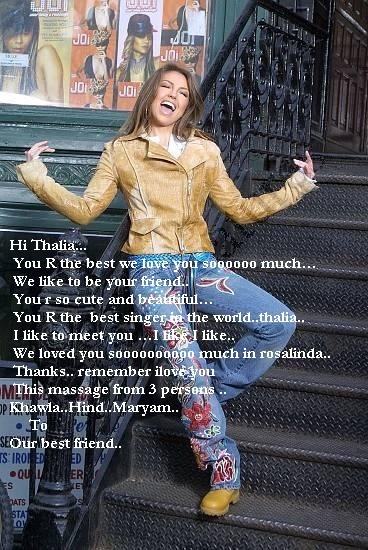 for her fans.Thalía is simply the best. She is a proud for the men kind. I'm glad that God gave her a special gift who she can share with us, her fans. And now that she is making an English Popalbum the whole world is gonna know her now! She's a diva, a treasure to us. I will love and adore her as long as I live. Why? Because she deserves to be loved! Thalía is an ANGEL!